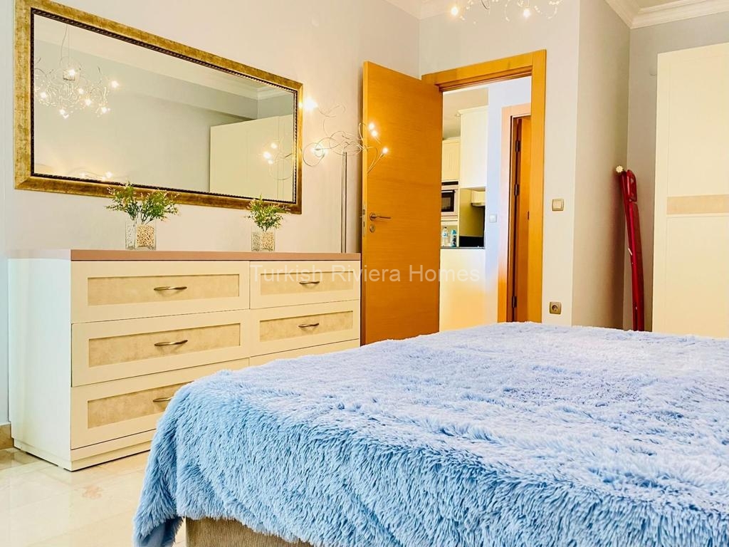 شقة بغرفتي نوم تقع في منطقة جميلة في ألانيا. توجد في الطابق الثالث ضمن مجمع راقي في الجهة الغربية. تحتوي على غرفتي نوم، حمام/مرحاض، شرفة بإطلالة جذابة على البحر و المسبح و الساحات الخضراء، مطبخ بمخطط مفتوح على غرفة المعيشة. تبلغ مساحتها 90 متر مربع بسعر مثالي 128,000 يورو.