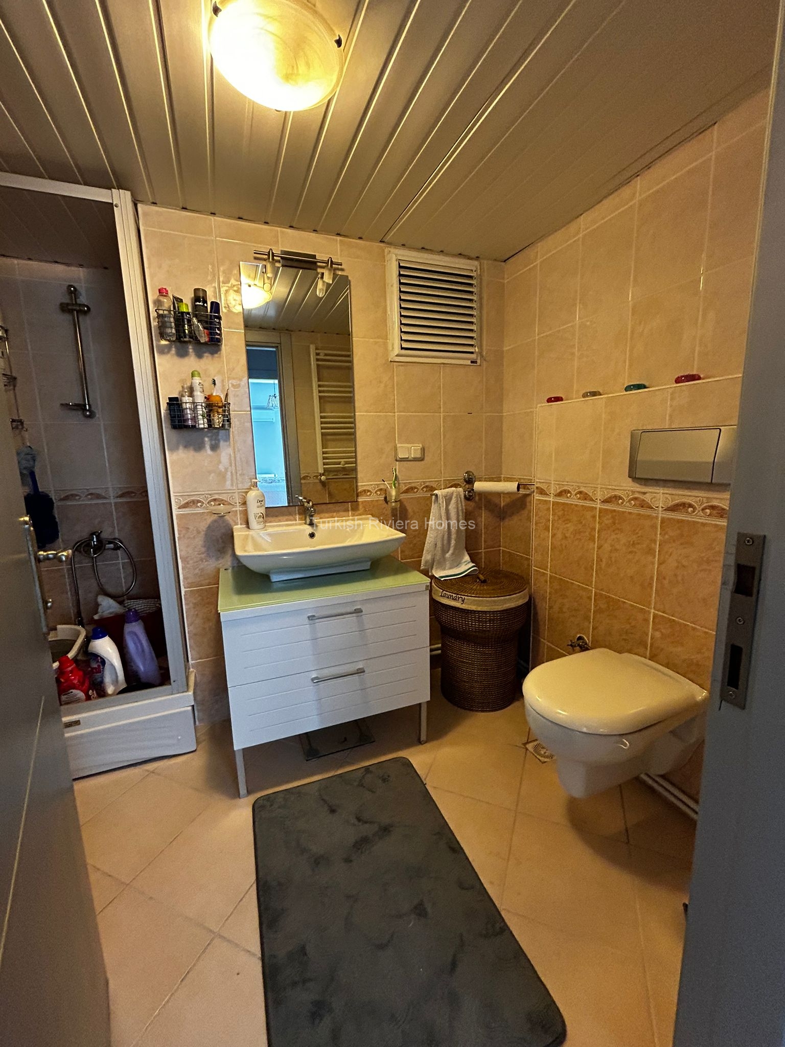 الحمام الداخلي مذهل. تحتوي على مساحة حمام مغلقة بالزجاج ومجهزة بصنبور حديث ونظام دش. تحتوي المنطقة الخارجية على مرحاض مثبت على الحائط الغربي بالإضافة إلى حوض غسيل على سطح من الرخام.