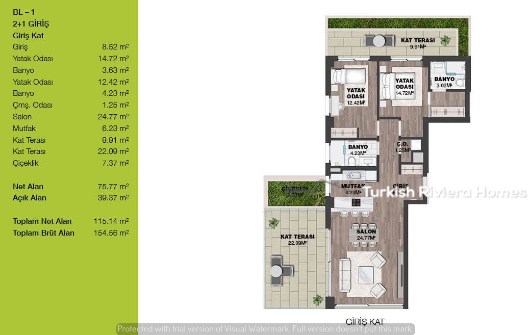 شقق 1+1 تبدأ المساحة من 92 متر مربع والاسعار تبدأ من 187000 يورو