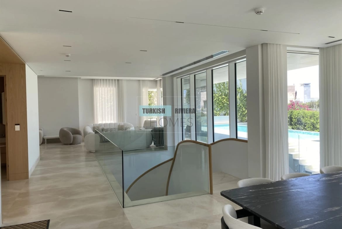 بُنيت هذه الفيلا على مساحة داخلية واسعة تبلغ 520 مترًا مربعًا على قطعة أرض مساحتها 965 مترًا مربعًا، وقد وُضعت بعناية فائقة لتستفيد من ضوء الشمس الطبيعي وتتمتع بإطلالات بحرية ساحرة من جميع الطوابق تقريبًا. ستدخل إلى منطقة معيشة واسعة ومفتوحة، حيث تُحيط النوافذ الممتدة من الأرضية إلى السقف بالخليج وكأنه لوحة فنية. تنساب غرفة المعيشة الفسيحة بسلاسة إلى تراس المسبح، مما يخلق ملتقىً مثاليًا للحياة العائلية والترفيه. يُشكل المطبخ الأنيق، المصمم بجمالية ووظائف عملية، خلفية مثالية لوجبات الإفطار الطويلة، وعشاء غروب الشمس، وغيرها من الأنشطة. تم اختيار جميع المواد، من الأرضيات إلى التركيبات، لتتكامل مع التصميم المعماري الأنيق والعصري للفيلا.