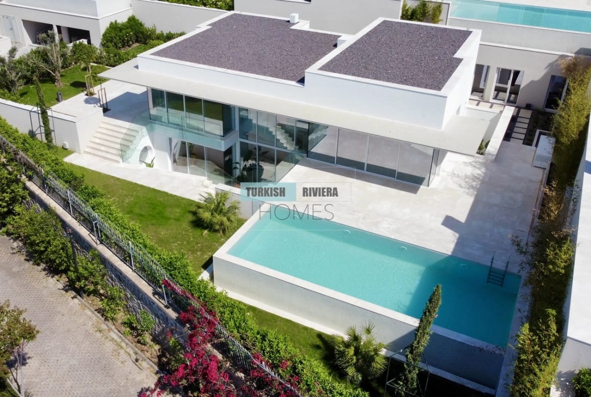 تقع هذه الفيلا الفاخرة، المصممة ببراعة هندسية، والمكونة من خمس غرف نوم، فوق بحر إيجة المتلألئ في منطقة ياليكافاك المرموقة، لتمنحك منزلًا أشبه بمنتجع عصري خاص. من لحظة وصولك، ستمتد أمامك مناظر بانورامية خلابة للبحر، حيث ترقص الشمس على الماء نهارًا، وترسم غروب الشمس الذي لا يُنسى السماء كل مساء. تقع الفيلا داخل مجمع سكني حصري مسوّر، وتحيط بها مساكن راقية أخرى، وتوفر لك خصوصية مطلقة، مع قربك من مرسى ياليكافاك الأنيق، ومطاعمها الراقية، ومتاجرها البوتيكية، وخدماتها اليومية الأساسية.