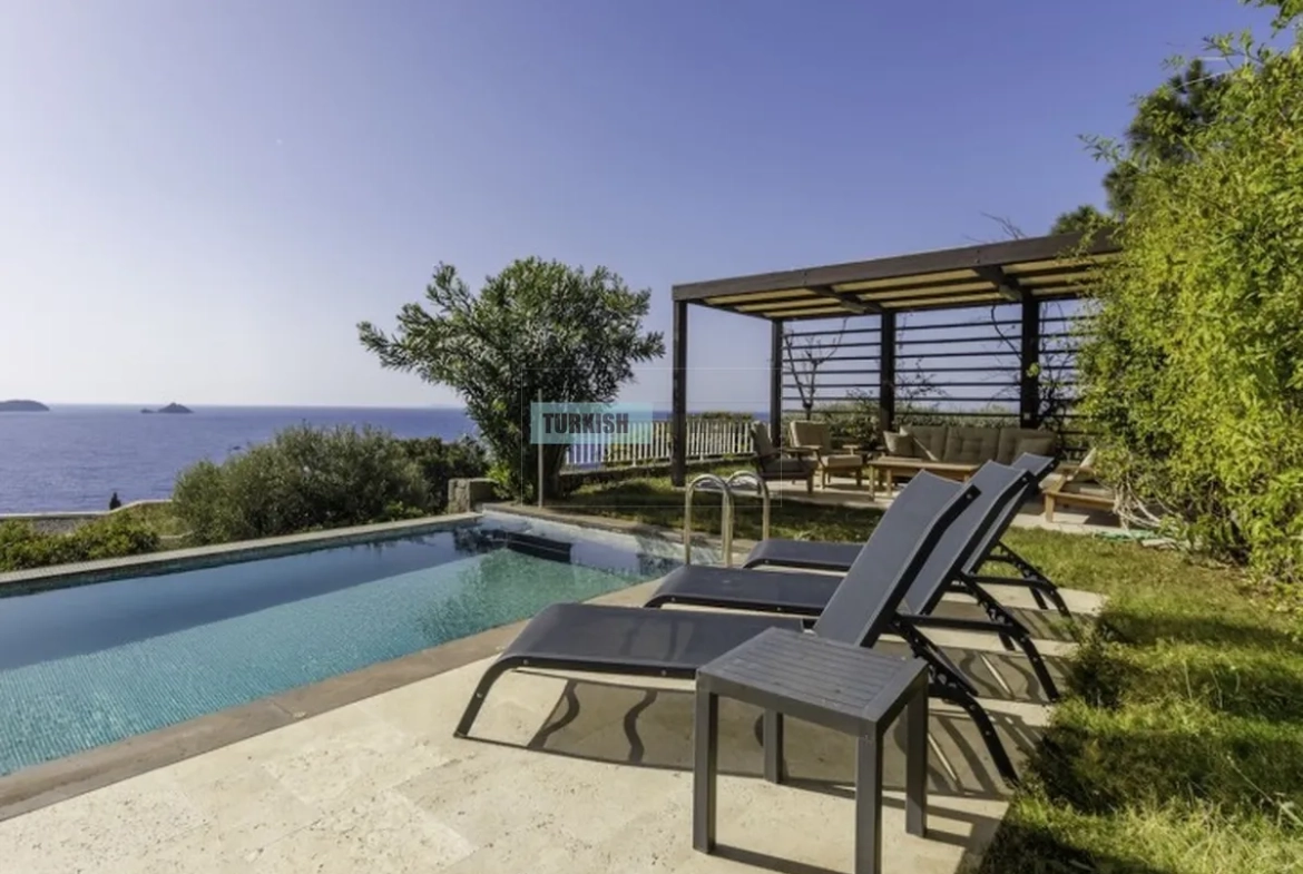 فيلا مفروشة بالكامل ومميزة لا ينقصها شيء مع شاطئ خاص بالقرب ياليكافاك. تقع في غوندوغان في موقع هادئ و خاص وحصري مع واجهة بحرية بالقرب من توركبوكو و ياليكافاك. يوجد بركة سباحة كبيرة و مشتركة، و شاطئ خاص رائع مع منصة استحمام. هذا العقار النادر للبيع في بودروم له إطلالات مذهلة خلال اليوم ووقت الغروب على كل من خليج غوندوغان والمناطق المحيطة بها الساحل من نحو البحر