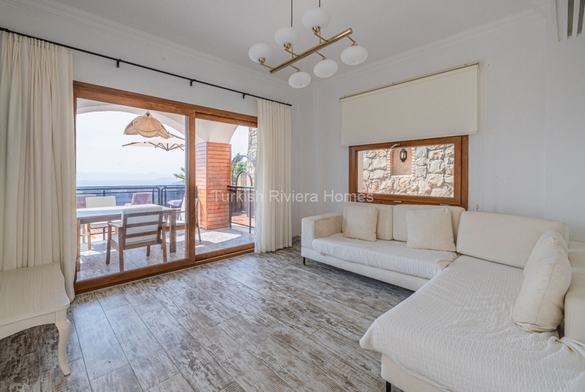 ادخل إلى عالم من الأناقة الراقية بينما تستكشف المساحات الداخلية لهذا السكن. تم تصميم مناطق المعيشة بعناية، وتربط بسلاسة بين المعيشة الداخلية والخارجية. توفر النوافذ البانورامية الكبيرة إطلالات خلابة على بحر إيجه، مما يخلق اتصالاً دائمًا بالجمال الطبيعي الذي يحيط بالملكية. تُعد غرفة المعيشة المزينة بمفروشات عصرية بمثابة نقطة محورية أنيقة للاسترخاء والترفيه.